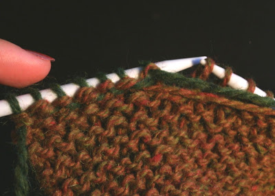 You just keep doing these 2 stitches, working alternately under the old yarn and then above it, working 4-6 stitches depending on how slippery your yarn is.